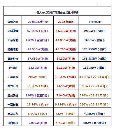 伴随着2023三季报出炉,晶科能源、晶澳科技、隆基绿能、天合光能、阿特斯、通威股份和东方日升等光伏上市公司2023前三季度组件出货量同步揭晓。