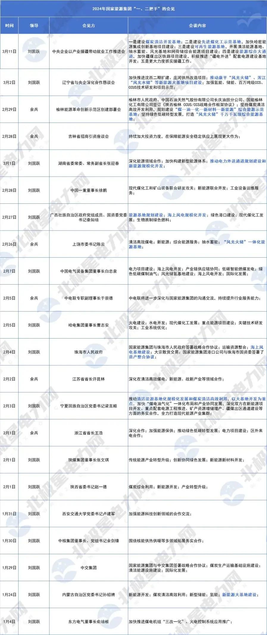 2024年,五大发电央企“一、二把手”陆续拜访了多个地方、企业高层领导,商谈新一轮的合作。据北极星电力网不完全统计,五大发电集团中,2024年国家能源集团的会见最多。2024年,国家能源集团董事长与总经理双线并进,在短短2个多月的时间里,已有22次重要会见,谈话重点当属“能源大基地”。
