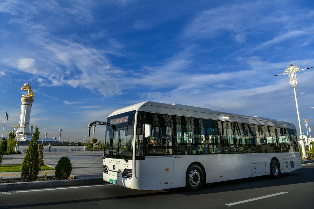 这是2023年11月26日在土库曼斯坦阿尔卡达格拍摄的电动公交车。新华社记者 曹阳 摄