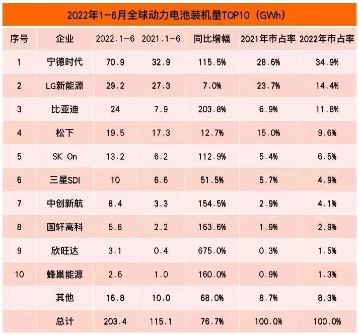 2022年上半年宁德时代以69GWh的装机量位居全球第一,同比去年同期的33GWh剧增111%,市场份额同比去年的29%提升了5个百分点。LG新能源上半年装机只有28GWh,同比去年27GWh微增4%,市场份额为14.9%,被宁德时代拉开距离。