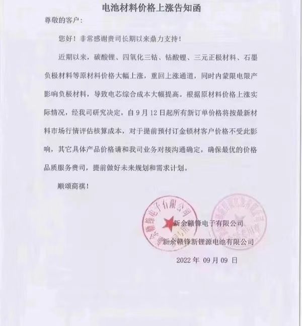 在这份9月9日向客户发出的告知函中,其表示,“近期以来,碳酸锂、四氧化三钴、钴酸锂、三元正极材料、石墨负极材料等原材料价格大幅上涨,同时内蒙古限电限产影响负极材料,导致电芯综合成本大幅提高。公司决定,自9月12日起所有新订单价格将按最新材料市场行情评估核算成本,对于提前预付定金锁材客户价格不受此影响。”